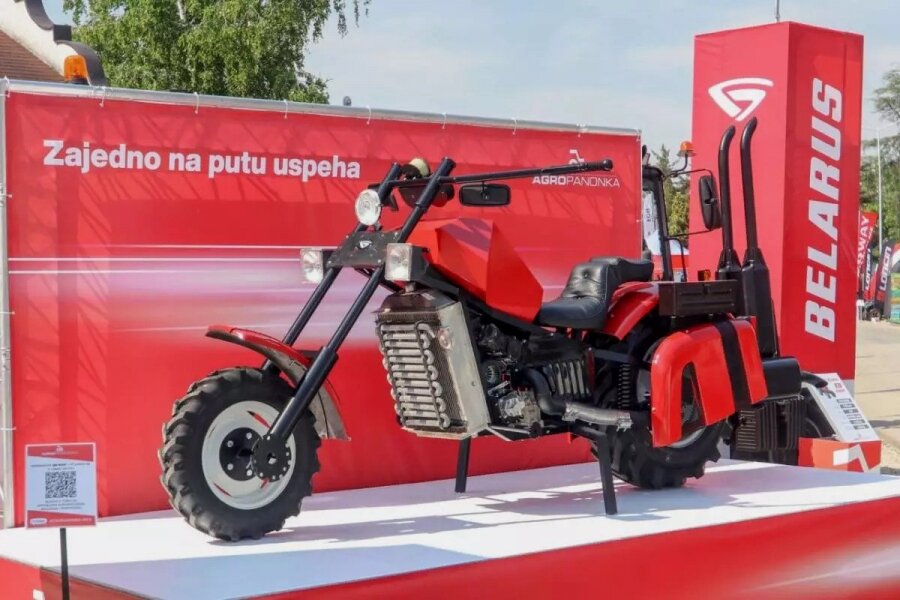Несколько дней назад в Сербии белорусский завод МТЗ показал макет «трактороцикла» — необычного двухколёсного транспортного средства, похожено на большой чоппер с колёсами от трактора «Беларус».