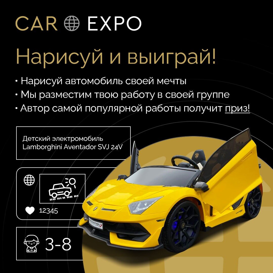 В честь дня защиты детей мы запускаем розыгрыш для наших юных водителей 🚘 Условия крайне просты: 🔥Нарисовать любую машину из нашего каталога и направить в личные сообщения группы фото рисунка с контактными данными родителей. 👉🏻Перейти в каталог 🔥Подписаться на наше сообщество ВКонтакте CAREXPOGROUP 🔥Сделать репост конкурсной записи себе на страницу Призы: 1 место – детский электрокар Lamborghini Aventador SVJ 24V 2 и 3 место – AUDI R8 COUPE, в масштабе 1:64 Имена наших юных победителей узнаем уже 15 июня! Правила конкурса: 📌 Участники - дети в возрасте от 3 до 8 лет 📌 1 участник - 1 рисунок 📌 Рисунок нарисован на бумаге, цифровые иллюстрации не принимаются. 📌 Страница родителя, который отправляет рисунок должна быть настоящая и открыта, не созданная для участия в конкурсах. 📌 Победитель будет определен по количеству лайков на фото, которые будут размещены в конкурсном альбоме , в спорной ситуации - будет проведено голосование на странице группы. 📌 При выявлении нак