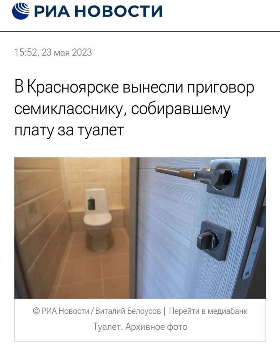 🤔Ученика седьмого класса в Красноярске приговорили к году лишения свободы за то, что он собирал с других учеников деньги за посещение туалета. "Мамкин бизнесмен" требовал по 20 рублей за один визит. "Короля унитазов" поймали, когда один из школьников пожаловался родителям, что задолжал ему 2,000 рублей. Подпишись пожалуйста ! Тебе не сложно , а мне приятно! 😊