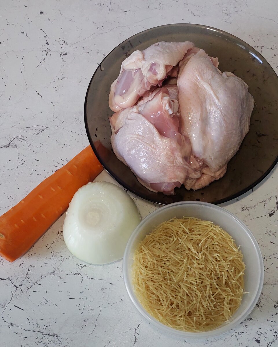 Лук нарезаю на небольшие кубики, а морковь соломкой, как для плова. С курицы я сняла шкурку, но вы можете оставить, если любите.