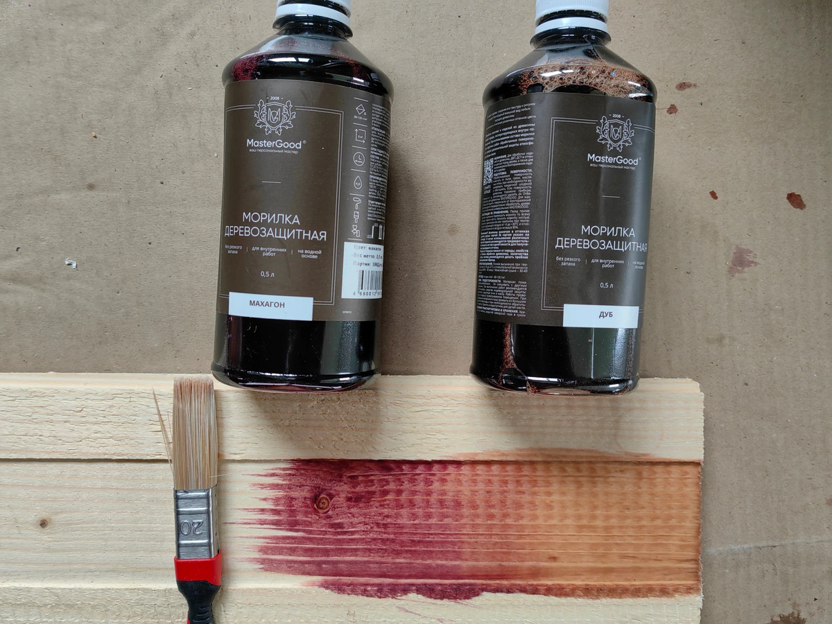 Купила в Петровиче морилку, чтобы покрасить деревянную кровать. особого выбора в магазине не было, стояли только бутыли с названием MasterGood. Я купила пару бутылочек с разными цветами-дуб и махагон. Попробовала на дощечке, нанесла губкой. Вроде, цвета неплохие вышли, посередине между ними переход из двух цветов. Но проблема постерегла, откуда не ждали. Оказалось, что когда красишь большой предмет, то морилка не так уж и насыщена, как на пробной доске. Два слоя морилки дуб выглядели на кровати из ели уж очень бледно и не вписывались в концепцию "Ярко, натурально, а сверху еще и лаком покроем". Вторым минусом морилки оказался ее расход-наносила губкой и как раз бутылка ушла лишь на одну спинку кровати. А еще при нанесении губкой она почему-то пенилась. Пришлось подкупить еще пару бутылочек и немного добавить второй цвет для яркости- "Махагон" примерно 1/13, дабы не уйти в малиновый цвет, а то и фиолетовый, оттенок. Я морилкой раньше пользовалась, пробовала и на водной основе, и алки