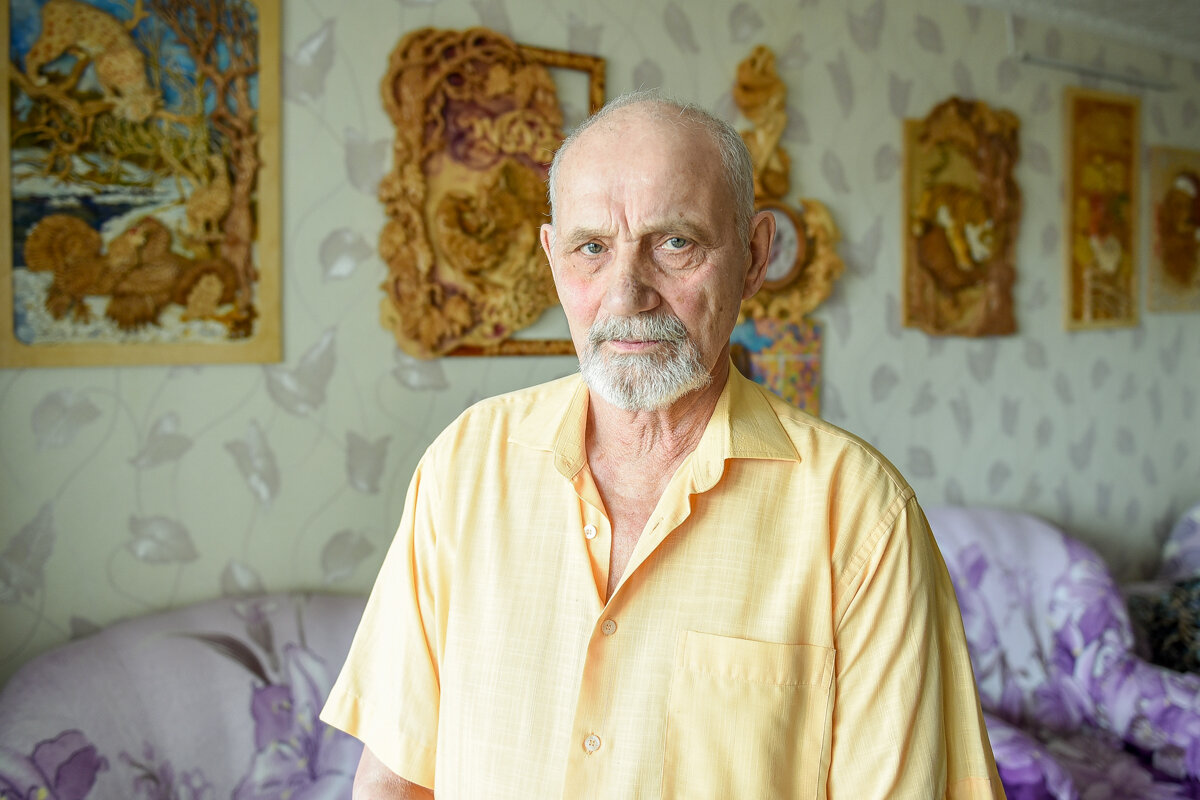 Он не профессиональный художник, но его квартира в обычной благовещенской многоэтажке — настоящая выставочная галерея. Ради любви и семьи талантливый студент худграфа отказался от учебы в Ленинграде, но не отказался от своего призвания — он всю жизнь создает прекрасное. «Самые сильные эмоции — когда ты видишь, что твоя работа кого-то по-настоящему поразила, удивила», — признается 75-летний пенсионер Виктор Дьячков. От карниза до иконы Еще с порога квартиры Дьячковых понимаешь, что здесь живет человек с творческой душой и золотыми руками. В прихожей — огромная икона Албазинской Божией Матери с собором и ангелом-хранителем, вырезанная из дерева, под ней — резной столик со шкатулкой. И даже часы, зеркало, арка со светильником и карнизы на окнах — из дерева. Мы встретились впервые, однако хозяин сразу переходит «на ты» и бесконечно шутит. В этом весь Виктор Петрович — обаятельный и открытый. — Вот смотри, какой тигр. Меня привлекает грация диких животных, — показывает на ювелирную резьбу