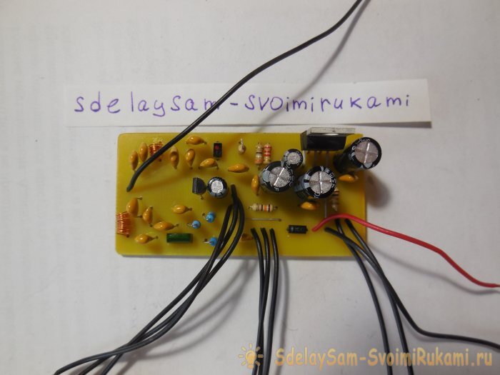 Сначала впаиваем небольшие детали – резисторы, конденсаторы, варикап, транзистор, микросхемы. Затем крупные электролитические конденсаторы и намотанные катушки. При запаивании катушки следует зачистить лаковую изоляцию на её концах. Простейшая, но тем не менее эффективная антенна – кусок провода длиной около 70 см, расположенный вертикально, запаивается непосредственно на плату. После запайки всех деталей подключаем органы управления – потенциометры, провода для подачи питания, провода для подключения динамика/наушников. Проверяем правильность монтажа, смываем с платы остатки флюса, и на этом сборка завершена.
