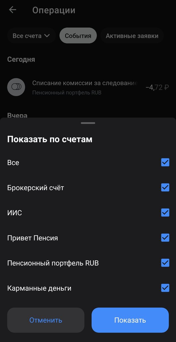 Последний раз писал про пенсионный портфель 12 мая, за это время счет увеличился еще на 3000 рублей за счет автопополнений. За все время счет пополен на 89 тыс рублей, текущий результат 99 490, то есть доходность составила 11,7 процентов за всё время. За 3 недели пришли купоны от Эталона - 68 рублей, М.Видео – 40 р, дивиденды от Новатэка – 121 р, Банк Санкт-Петербург – 211 р. Всего: 440 рублей. Совсем недавно узнал, что в приложении (Тинькофф инвестиции) можно отсортировать операции по счету. Это в том случае, если у вас несколько счетов, а вы хотите посмотреть движение денежных средств только по одному из них ( Операции – все счета – ставим галочку на том счете, который интересует – показать – Все). Понемногу счёт пополняется, в больше степени за счет пополнений, но купонно-дивидендный поток растет. Доля Акций/облигации/фондов в данном портфеле – 40/33/21. То что лежит в фондах в большей степени заморожено (фонды Финекс, РСХБ). Доля их падает, так как растет доля акций и облига