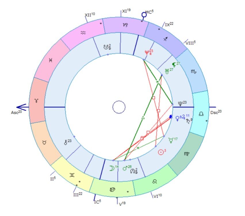 В наше время почти все знают, кто такая Елена Блиновская. Ее способ достижения известности достаточно спорный, но тем интереснее посмотреть, какие показатели заложены у нее в натальной карте. Итак, кратко разберем натальную карту Елены (этот разбор является краткой версией и соотносится с фактами, которые находятся в общем доступе). Время рождения, которое транслируется в сети 21.40-22.00, возьму среднее значение, которое тоже распространено в сети – 21.50, город Опарино, Кировская область, 25.08.1981 Солнце у Елены в Деве, имеет всего один квадрат от Урана без каких-либо гармоничных поддерживающих аспектов – самооценка не стабильна, она в целом по Деве достаточно устойчива, хозяйственна, расчетлива, при этом, единственный аспект - квадрат от Урана дает капризность, эксцентричность, раздражительность. Постоянное нервное напряжение, недовольство результатом, при этом может делать, что хочет, без оглядки на нормы и правила. Луна в Раке, в квадрате от соединения Сатурна, Юпитера, Венеры –