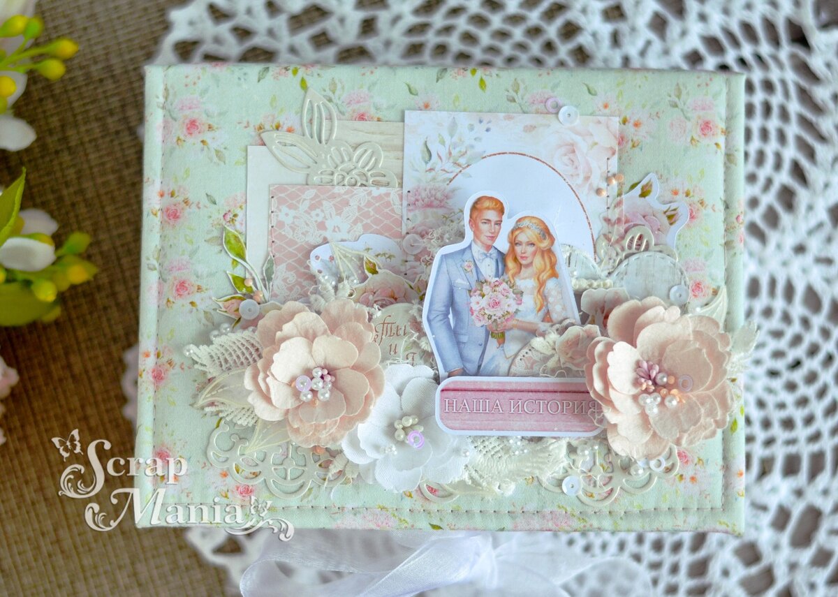 Всем привет! С вами Наталья Пиксаева и я рада показать вам мою вторую работу для ScrapMania, созданную из нежной и чудесной коллекции "Свадебный букет". Я создала свадебный дуэт, в который входит альбом для свадебных фотографий в подарочной коробке Для работы использовала набор 30,5х30,5см, а также листы для вырезания этой же коллекции. Еще в этой коллекции есть ткань, которой я обтянула корпус шкатулки сверху и снизу, а сам короб обклеила листами с деревянным принтом. Получилось очень симпатично и создало иллюзию деревянной шкатулки. На обложку добавила пару, а так же надпись из карточек коллекции. Карточки очень плотные, поэтому даже не стала их подклеивать на картон, они и так прекрасно справляются со своей функцией. Внутри шкатулки спрятан небольшой, но очень вместительный фотоальбом с файлами и кармашками, в него помещается больше 50 фотографий. На обложку альбома добавила шейкер, который шуршит и переливается, если потрясти немного. Вырезала из карточки рамочку, добавила ткан