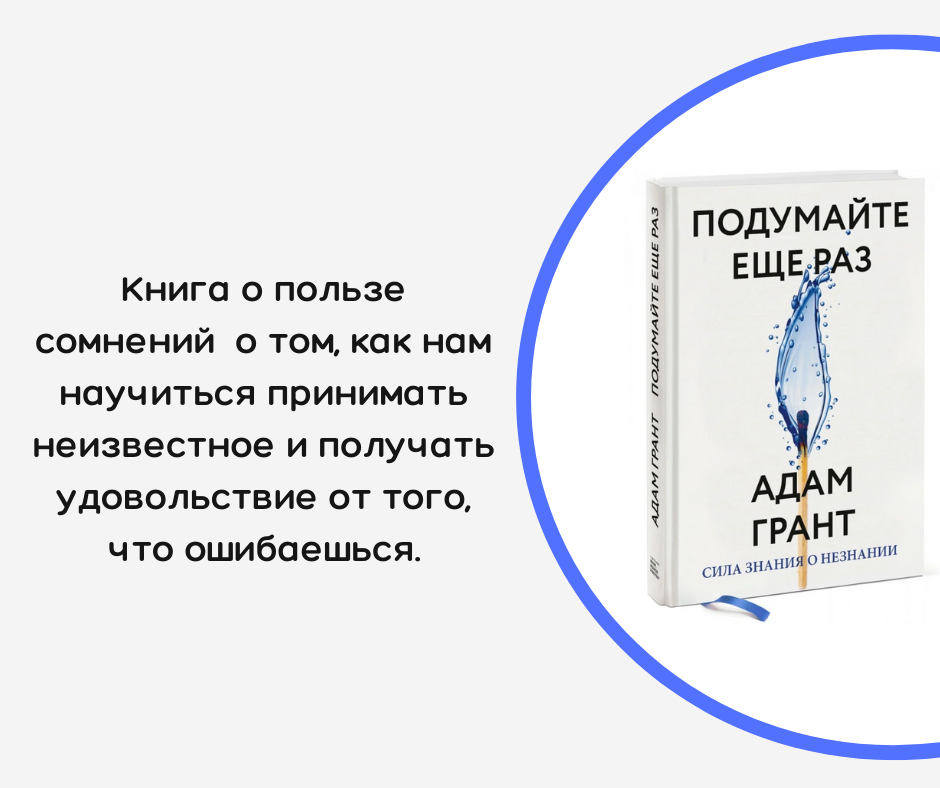 Книга Адама Гранта «Подумайте еще раз» призывает всех овладеть мышлением ученого и ставить под сомнение свои убеждения, общественные установки, да и любую информацию, с которой вы имеет дело. Только так можно узреть истину! Это сложно. Но именно это, тот самый когнитивный навык, который нужен нам именно сейчас.