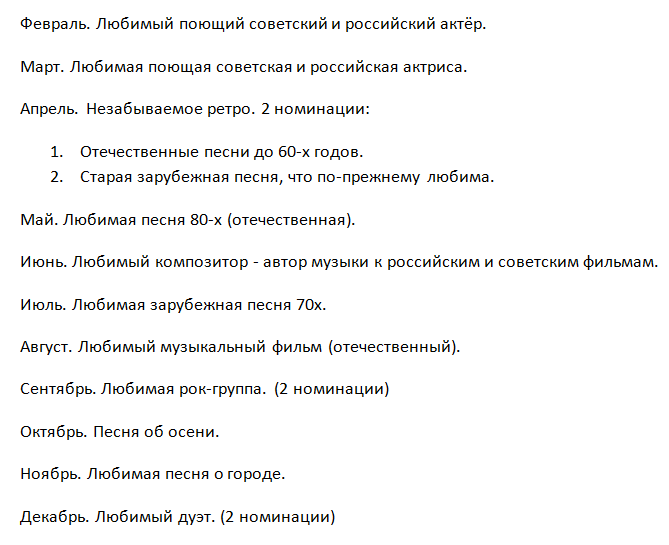 Здравствуйте! Мы тут часто проводим коллективные мини-проекты, связанные с песнями и музыкой разных лет, композиторами, поэтами-песенниками и исполнителями. Чтобы не было споров, провели голосование, которое определило порядок проведения этих проектов. И даже распределили их по месяцам - составили небольшой план. Мы придерживаемся очерёдности тем, правда, план опережаем на месяц. Покажу сейчас этот план: Итак, очередная тема - "Любимая зарубежная песня 70-х". От читателей поступило предложение разделить 70-е на 2 части, иначе проект окажется слишком большим. Мы так и поступим. Сначала поработаем по теме "Любимая зарубежная песня 70-х (1-я половина)". Берём песни, рождённые с 1970 по 1974 год. Как у нас проходят проекты? Вы подаёте заявки на песни, которые будут претендовать на звание самой любимой, а я размещаю ваши рассказы и слушаем песни. Потом тур за туром голосуем, выбираем самую любимую для большинства читателей этого канала. Наши проекты расширяют кругозор. И читателей, и м