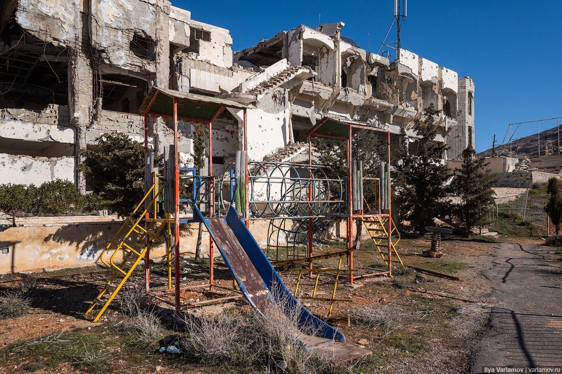 03. Сколько тут сейчас живёт людей, никто не знает, но точно заметно меньше. Машин нет, улицы пустые. Несмотря на то, что сирийские военные выбили отсюда боевиков несколько лет назад, народ не спешит возвращаться в свои дома.