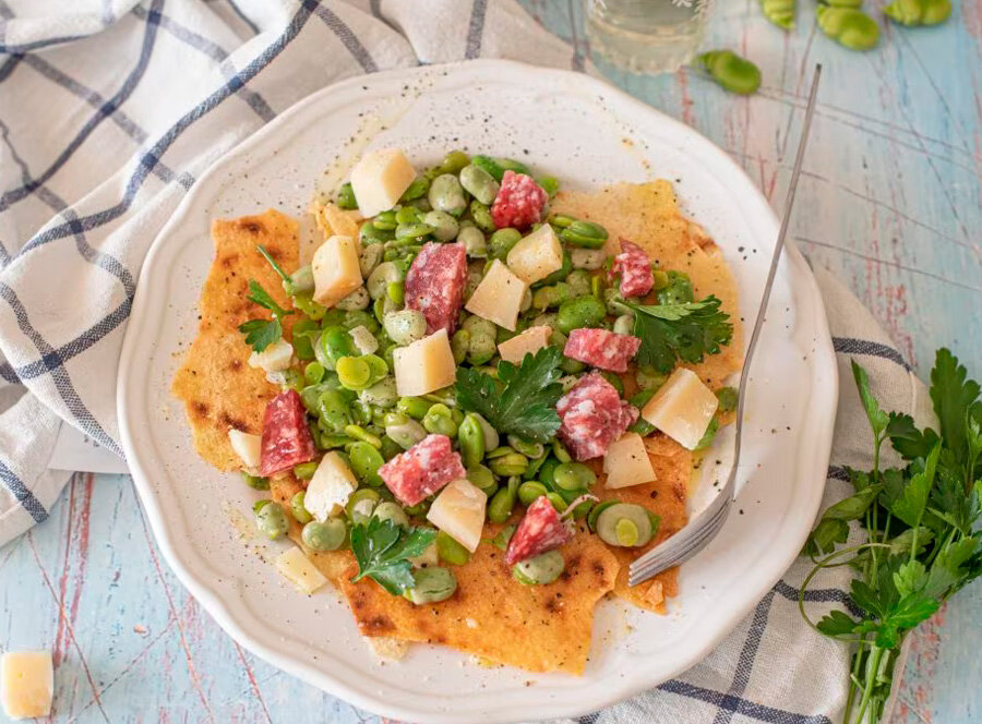 Очень простое в приготовлении блюдо. Этот нежный и свежий рецепт идеально подходит к рыбе, но может употребляться и в качестве основного блюда. Для приготовления салата можно использовать сырую фасоль или бланшировать ее в течение нескольких минут: если у вас хватит терпения очистить внешнюю оболочку от крупных кожурок, вы получите элегантное и приятное блюдо, вдохновленное традициями Сардинии (Италия). Ингредиенты: Приготовление: