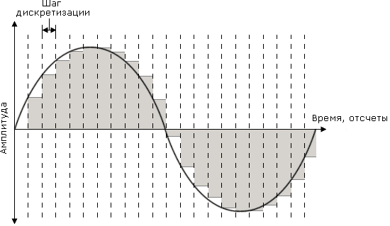 При дискретизации сигнал разбивается на равные временные интервалы, называемые отсчетами. Частота дискретизации определяет количество отсчетов, которые берутся за секунду. Например, при частоте дискретизации 44,1 кГц (или 44 100 Гц), сигнал делится на 44 100 равных интервалов в секунду.