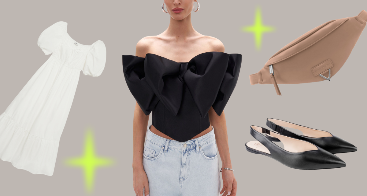 Акцентное решение для вечерних выходов — топ с декоративным бантом — это сразу и отсылка к гламуру восьмидесятых, и горячий микротренд этого лета. Идеально сочетается с широкими брюками, юбками в пол и теми же мини.