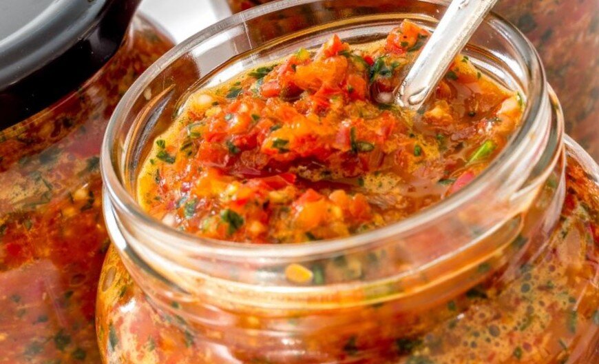 Морковь шинковкой чистим, моем и рубим ножом на кубики средней величины. Опускаем морковь в казанок в подсоленную кипящую воду кипятим 3 минуты. Остужаем в холодной воде, выкладываем в дуршлаг. Стручок красного перца вымываем, очищаем от семян вырезаем плодоножку, измельчаем ножом мелко. Бланшируем около 2 минут, обдаем холодной водой. Зелень петрушки и базилика моем, высушиваем бумажным полотенцем и мелко шинкуем. Чеснок очищаем и мелко рубим. Ингредиенты смешиваем. Полученную массу, перекладываем в предварительно подготовленные банки. Стерилизуем литровые банки при температуре 100 С в течение 1 часа. Затем укупориваем и ставим на полочки для дальнейшего хранения.