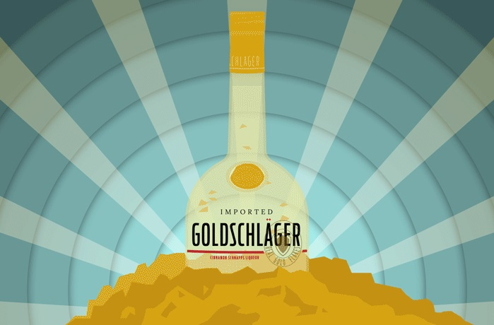 Goldschläger, немецкое слово, которое «относится к производителям сусального золота, которые перемалывают слитки мягкого золота в тонкие листы», согласно описанию на веб-сайте Sazerac, описывается как содержащий «легкие, как перышко, приятные на вкус золотые хлопья».
