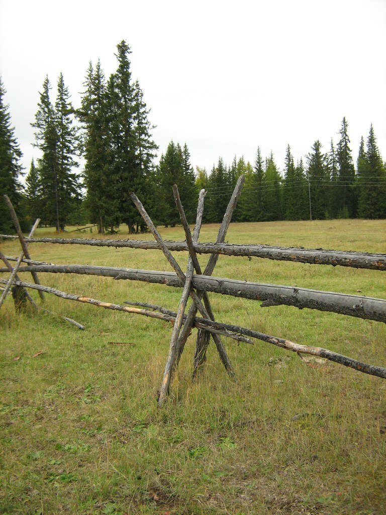 Как строить изгородь без единого гвоздя и инструментов? Жерди и колья, конечно, заготовляются в лесу топором и перетаскивается на место строительства. Для нижних опор можно применить любые подходящие обрубки — пни, доски и.т.д. Для устойчивости их можно чуть заглублять или можно просто поставить на землю. Колья парами крест на крест втыкают в землю на глубину 5 - 10 см от руки. Они с двух сторон прислоняются к нижней жерди и намертво прижимают ее к опоре. Между опорами расстояние 2,5 – 3 метра. На эти и последующие опоры на колья сверху ложат второй ряд жердей. Таким же образом делают третий уровень. Как видно на фото, все четыре кола располагаются строго на своих местах и как бы заклинивают друг друга. Все это строение можно разобрать, только сняв верхний жердь. Такие изгороди могут стоять годами, пока заглубленная часть жердей не сгниет. Строится ботулу (ударение на “о”) из самой крепкой породы деревьев в наших местах – лиственницы. В болотистых участках ботулу намного устойчивей о