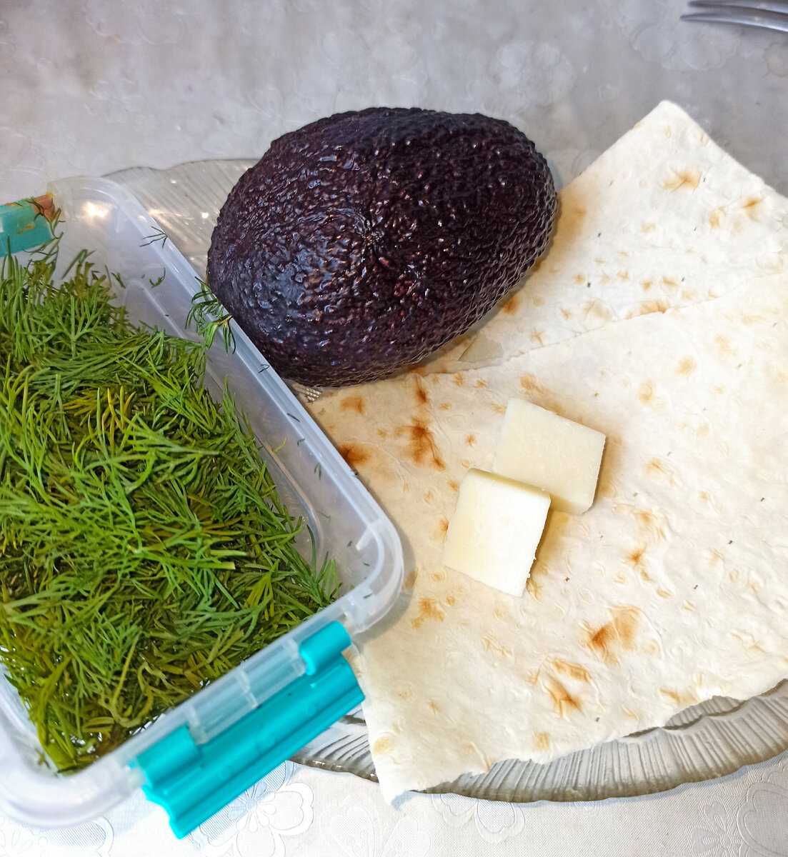 Всё ингредиенты выкладываем на лаваш. Авокадо разминаем вилкой и вместо масла "размазываем" по лавашу. Затем трём сыр, у меня нашёлся заранее нарезанный укроп.