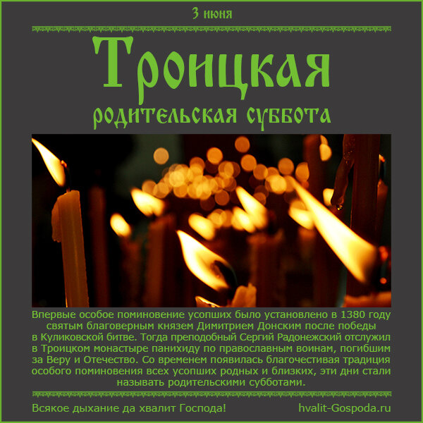 Наши почившие родные и близкие ждут наших молитв! Сами они уже не могут повлиять на свою посмертную участь, а мы можем! Не забудьте помолиться за них на литургии и панихиде, подать за них записки, принести продукты «на канун», подать милостыню в их память. И, конечно же, жить по-христиански. Если они вольно или невольно подали нам дурной пример, то мы, совершая дурные поступки, и сами себе прокладываем дорогу в ад, и их туда подталкиваем. Впервые особое поминовение усопших было установлено в 1380 году святым благоверным князем Димитрием Донским после победы в Куликовской битве. Тогда преподобный Сергий Радонежский отслужил в Троицком монастыре панихиду по православным воинам, погибшим за Веру и Отечество. Со временем появилась благочестивая традиция особого поминовения всех усопших родных и близких .Эти дни стали называть родительскими субботами. ТРОПАРЬ за умерших, глас 2 Помяни, Господи, яко благ, рабы Твоя,/ и, елика в житии согрешиша, прости:/ никтоже бо безгрешен, токмо Ты,// моги