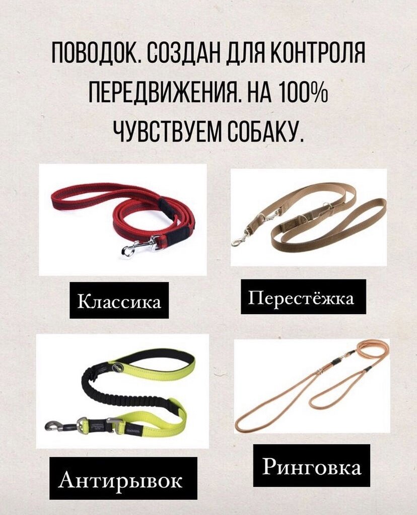 Поговорим про амуницию. Что для чего, зачем и почему. И один из самых популярных вопросов: «Шлейка или ошейник?». Давайте разберём подробнее всю амуницию. - Классика: обычный поводок, но всегда обращайте внимание на карабин, оне не должен быть невесомый - это признак дешевого порошкового металла, который при резкой нагрузке просто разлетится. Что касается метража, то для прогулок 2-3 метра будет достаточно. - Перестёжка: позволяет изменять длину, а так же его можно пристегнуть к поясу для пробежки. - Антирывок: не позволяет вам вырвать руку. Только для крупных пород. - Ринговка: исключительно для выступлений на выставках. 2. Рулетка. Создана для свободного выгула. Коррекция на такой амуниции не продуктивна. Бывают: тросовая и ленточная. ❗️Хочу обратить внимание, что рулетка не подходит для дрессировки, поэтому я всегда прошу приходить на занятие с поводком. Остерегайтесь тросовых рулеток и некачественных карабинов. Плюс на рулетке мы не на 100% чувствуем собаку, поэтому будьте более вн