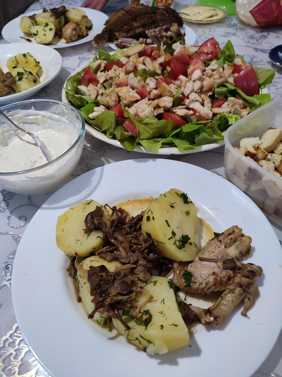 Сегодня о продуктах и питании моей семьи. Рада видеть вас на страницах моего онлайн - дневника. Вы уже знаете, что запасы продуктов мы немного пополнили. Я показывала вам, что мы купили в магазинах. Дополнительно муж покупал домашние яйца, творог, сгущёнку, вафельные коржи, картошку, сметану, рыбу и куриные бедра. Это те продукты, которые в магазине не купишь. Вчера приготовила три блюда из одной курицы. Не знаю как люди готовят по десять. Вам удавалось? Нет, я, конечно, прошла школу жизни и тоже варила кашу на одном кусочке куриного филе и ели мы эту кашу два дня. Но это же экстремальная экономия. Мяса в этой каше только для аромата. Не хочу больше так жить. Очень надеюсь, что не придётся. Продолжаю потрошить свою морозилку. Юля прятала в неё недавно тесто и колбасу. Я достала, поставила подходить размороженное тесто и включила разогреваться духовку. На огонь поставила гречку вариться. К ней у меня в холодильнике была курица с грибами. Пока суть да дело, подготавливаю ингридие