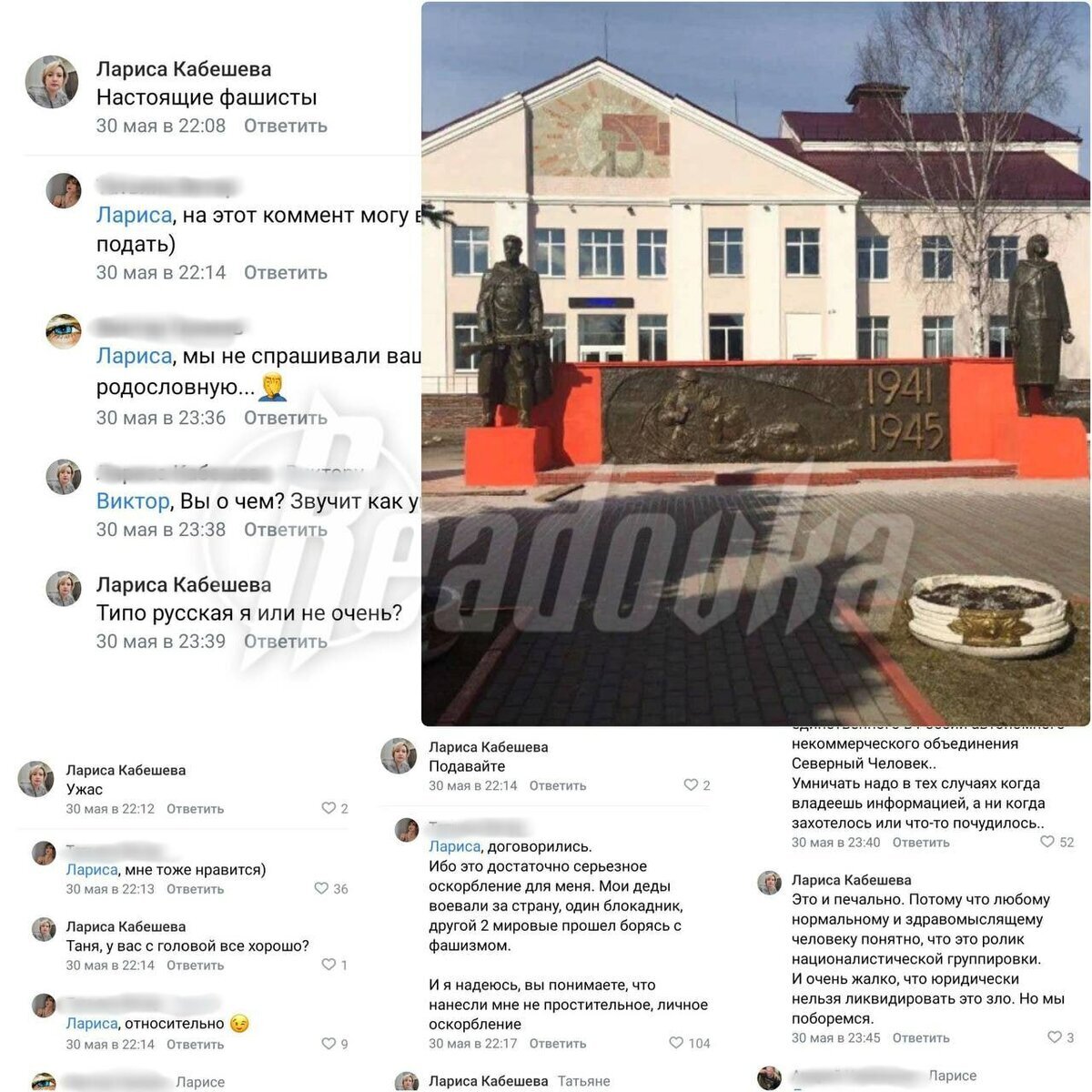 Также она выступала за снос памятника односельчанам, погибшим в Великой Отечественной войне. Лариса Кабешева, начальник управления культуры и молодежной политики (!) Уренского района Нижегородской области. Она прокомментировала в соцсетях видеоролик объединения «Северный Человек», назвав участников этого патриотического движения «настоящими фашистами». В ответ на это лидер объединения Михаил Маваши заявил, что юристы движения готовят обращение в Генпрокуратуру по факту разжигания межнациональной розни. При этом, как указывают сторонники «Северного человека», Кабашева ранее сама показала себя с «фашистской» стороны и призвала убрать памятник Великой Отечественной войны на центральной площади села.