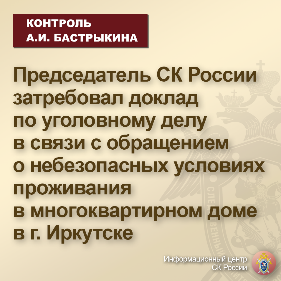Председатель Следственного комитета Российской Федерации Александр Иванович Бастрыкин затребовал у руководителя СУ СК России по Иркутской области Анатолия Викторовича Ситникова доклад о предварительных и окончательных результатах расследования уголовного дела, а также проделанной работе по восстановлению жилищных прав граждан.