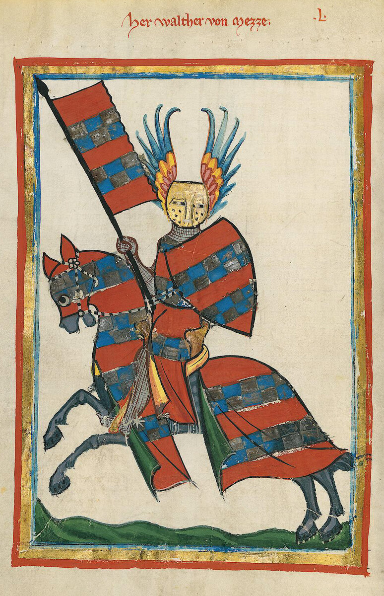 Продолжаем знакомство со средневековыми рыцарями, портретами которых мы любовались недавно: Напомню, что мы взяли 10 изображений конкретных рыцарей из Манесского песенника 14 века, руководствуясь исключительно оригинальностью их нарядов, в особенности - шлемов. Все эти рыцари попали в песенник по той причине, что были известными миннезингерами. И теперь у нас серия статей, в которых мы пытаемся увидеть живых людей за красочными средневековыми миниатюрами: Часть 1. Часть 2. Идем дальше. Пятый рыцарь у нас известен только именем и примерной датой смерти. По крайней мере мы знаем - в каком веке он жил. Это - герр Вальтер фон Метце (который умер до 1276 года): Весь такой шахматно-полосаты с крыльями... А вот следующий, шестой рыцарь - был великим поэтом, произведения которого вдохновляют читателей до сих пор. Вольфрам фон Эшенбах (около 1170 - около 1220 года): О нем точно ничего не известно. А все, что известно - это предположения, которые вытащены из его произведений. То есть некие домыс