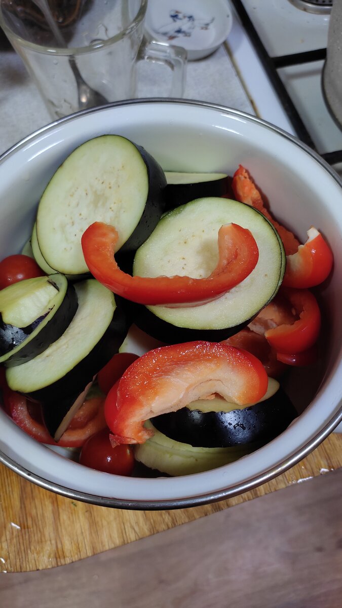 Добрый день всем! Сегодня у меня опять ужин, приготовленный на мангале. В этот раз овощи. Я взяла один небольшой молоденький кабачок, один баклажан, сладкий перец, несколько черри. Баклажан нарезала кольцами и на некоторое время замочила в солёной воде, чтоб ушла горечь. Кабачок и перец тоже нарезала, черри целиком. Всё посолила, добавила специи, немного растительного масла и оставила мариноваться, пока прогорали дрова в мангале. Затем всё выложила на два слоя фольги и закрутила. Готовила на решётке над углями. Вкусный, полезный и лёгкий ужин готов. Приятного аппетита! Спасибо за внимание, ваши 👍, подписки. Всем мирного неба и добра!