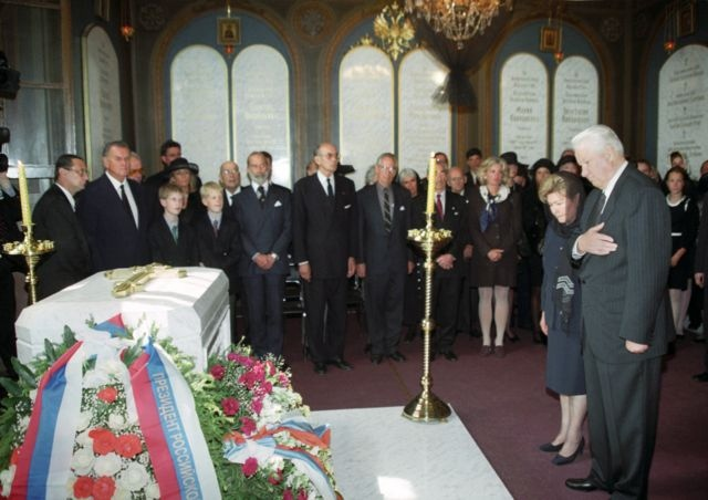 Представители Дома Романовых и захоронение лже-останков Царской семьи в 1998 году.