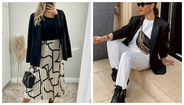 Если в вашем гардеробе уже давно появился классический черный пиджак, но вы не можете найти ему нужное применение, оставайтесь с нами, мы знаем, как пробудить вдохновение в данной ситуации. Начнем с модного на сегодняшний день образа в стиле кэжуал. Он включает в себя черный пиджак, принтованную оверсайз футболку с неоновыми выставками, а также ботильоны с квадратным мысом. Логическим завершением этого образа стала стеганая черная сумка из натуральной кожи. Запомните следующую формулу, она точно вам пригодится в этом году: черный пиджак + модные джинсы с разрезами + блуза с рюшами + обувь с квадратным мысом на высоком каблуке. Образ в котором вы будете выглядеть максимально стройно и изящно включает в себя модный пиджак, скинни брюки с разрезами, кружевную блузу, стеганый клатч, а также комфортные кроссовки. Следующий образ отлично подойдет для определенной тематической вечеринки, он состоит из темного укороченного пиджака, белой футболки, латексной мини юбки, яркой обуви и клатча. Юбк