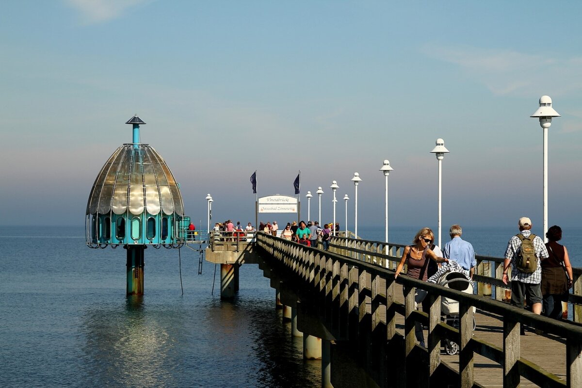 На германском курорте Цинновиц вглубь Балтийского моря уходит длинный пирс, на краю которого прямо из воды возвышается странное сооружение. Оно напоминает беседку, похожую не то на колокол, не то на нераскрывшийся тюльпан бутоном вниз, не то на странный зелёный гриб. Это не просто «морское кафе», где можно было бы поужинать с панорамным видом на уходящую в горизонт водную гладь. «Подводный лифт» – так называют Цинновицкую погружную гондолу, которая способна опуститься на 8 метров под воду вместе с посетителями внутри. Немецкое название этой конструкции можно перевести как «гондола для дайвинга» или «гондола-дайвер». Но в отличие от настоящего дайвинга, здесь вам не потребуются ни специальное оборудование, ни навыки, чтобы познакомиться с подводным миром. Погружную гондолу спроектировал инженер Андреас Вульф. Сооружение заработало в 2006 году и стало первым в своём роде «подводным лифтом». Кабина крепится к металлическому столбу высотой 10 метров и благодаря двум электродвигателям сколь