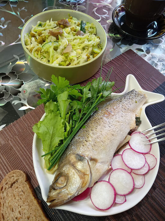 Вернулась домой из больницы. Устроили с мужем ужин «за возвращение». Форель тушила целиком - в сотейнике, на воде. Добавляла стебли сельдерея и укроп внутрь брюшка, и морковь кружочками - для мужа. Радостный летний салатик - капуста нового урожая, огурчик, зелёный горошек и несколько грибочков с горчичным маслом. Вкуснятина! И десерт, конечно же. С клубникой. Пачка творога 5 %, натуральный йогурт и клубника. Как хорошо дома! Клубники своей полно, зелень всякая выросла - укроп, петрушка, кинза, базилик, редиска, три вида салата... И всё в цветах! Особенно радуют розы - они уже огромные! Лето, друзья, лето... Радуемся! + 4 фото От наших друзей: Михаил Полицеймако, актёр театра и кино, на Радио Медиаметрикс Больше общения и рецептов - в группе "Рецепты для диабетиков" в ВКонтакте! Автор рецепта - Марина Лобастова