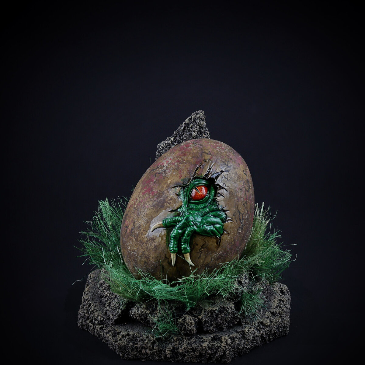 Динозавр на виньетке еще не полностью вылупился из яйца, но уже начал пробивать скорлупу. Его красный глаз, кажется, смотрит прямо на зрителя, словно он уже видит мир вокруг себя.