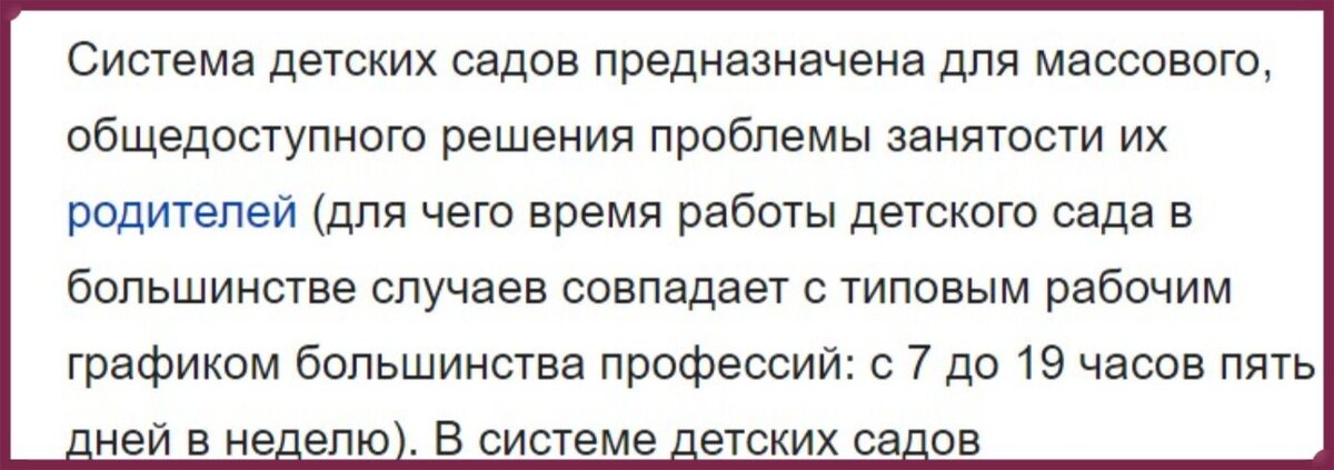 На самом деле детские сады изначально были созданы для того, чтобы родители могли работать! В интересах ребенка, чтобы родители зарабатывали на его полноценную жизнь: еду, одежду и так далее.