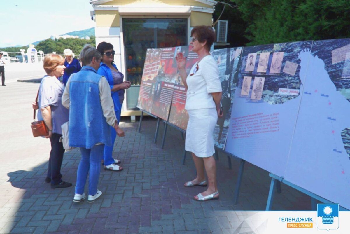 На площадке у историко-краеведческого музея работает передвижная выставка, посвященная 80-летию освобождения Краснодарского края от немецко-фашистских захватчиков и юбилею подвига легендарного десанта под командованием майора Цезаря Куникова.