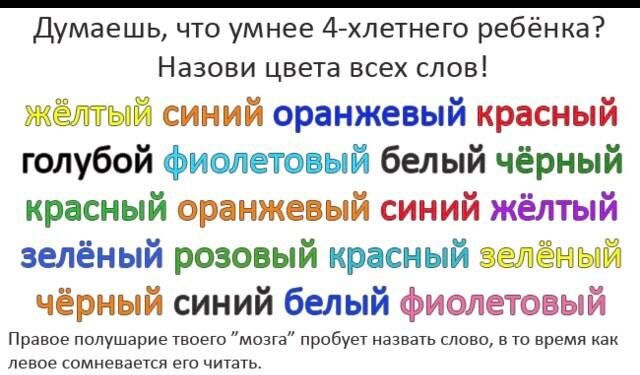 Посмотрите на разноцветный текст, представленный ниже. Как вы видите, он состоит из перечня цветов, но слова не соответствуют действительности. Ваша задача заключается в том, чтобы называть вслух цвет, которым написан текст. Как только вы дойдете до конца, задание стоит повторить, но уже с конца списка. По началу данное упражнение будет даваться с трудом. Затруднения возникают по причине того, что за восприятие текста и цвета отвечают разные полушария головного мозга. Польза упражнения: помогает сформировать новые связи между полушариями, улучшает концентрацию и внимательность. К тому же, упражнение служит эффективной профилактикой болезни Альцгеймера. Если понравился контент ставь 👍 и подписывайся на канал @mashka_romashka
