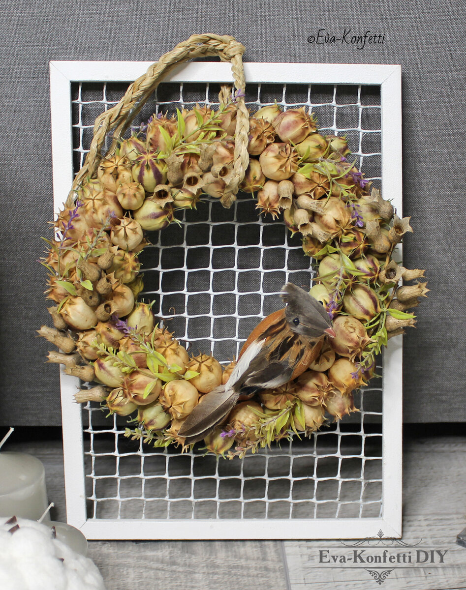 Всех приветствую!😍 У меня на канале есть отдельная рубрика в которой я делюсь с вами своими находками природных материалов. Зайдите посмотрите, сейчас начинается сезон заготовки материалов для творчества, возможно вы для себя почерпнете полезную информацию!👍 Там же я показывала коробочки Нигеллы, и как раз в сегодняшнем обзоре покажу, как можно ими декорировать веночек на дверь или раму, как это сделала я. Венок из сухоцветов своими руками СПИСОК МАТЕРИАЛОВ: Плетеную основу необходимо полностью заполнить коробочками Нигеллы. Я все элементы приклеивала на горячий клей. Коробочки старайтесь плотно стыковать друг с другом, чтобы по итогу было как можно меньше просветов. Когда основа будет полностью заполнена коробочками Нигеллы, венок можно дополнить веточками Белены с колокольчиками и искусственной или высушенный Лавандой. В завершении свой венок я дополнила птичкой и веревочкой. И в таком виде подвязала на раме. К раме я предварительно приклеила, а в некоторых местах закрепила строите