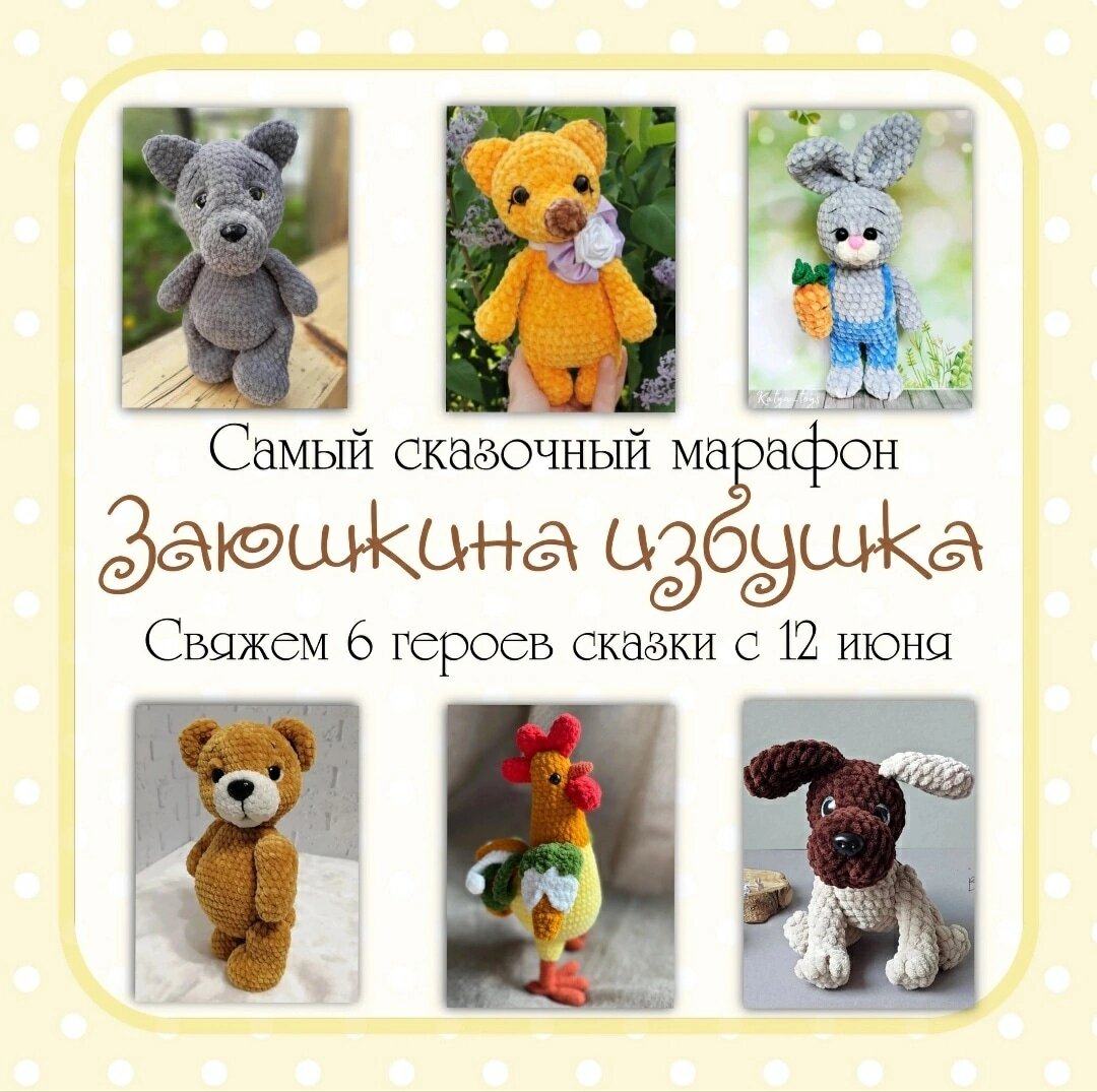 Для меня это первый и новый опыт. Я давно хотела собрать вокруг себя команду единомышленников и вот благодаря организации марафона команда есть. Нас 6 мастеров и мы смотрим в одну сторону. Вме из разеых городов с разным опытом и ращного вощраста, но все мы выражаемся в творчестве. Посмотрите какие добрые игрушки у нас вышли. Ниже условия проведения мараыона. Буду рада видеть вас в числе учасниц! Приглашаем вас на самый сказочный марафон Мы попадём в добрую сказку и свяжем всех 6 героев сказки "Заюшкина избушка": - лиса от Елены Бурдаковой - зайка от Katya Toys - собачка от Лены Терентьевой - мишка от Ольги Зайцевой- Дуденковой - волк от Натальи Малышевой - петушок от Алены Баландиной Старт вязания 12 июня! По окончанию марафона у вас также будет шанс выиграть крутые подарки от нас и наших спонсоров😍 Розыгрыш 05 июля ✅ набор пряжи и фурнитуры для вязания игрушки ✅ набор бирок победителю на выбор ✅ сертификат на 700 руб. от "УПАКУЙ-КА". ✅ сертификат на 500 руб. на пряжу