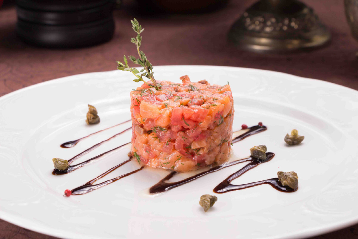 Привет! Я с удовольствием поделюсь с вами своим любимым рецептом рыбного тартара. Это блюдо очень простое в приготовлении, но выглядит и вкусно и изысканно. Ингредиенты: - 300 г свежей рыбы (лосось, тунец, форель и т.д.) - 2 ст.л. оливкового масла - 1 ст.л. лимонного сока - 1 ст.л. каперсов - 1 ст.л. мелко нарезанного красного лука - 1 ст.л. мелко нарезанного петрушки - 1 ст.л. мелко нарезанного укропа - соль и свежемолотый черный перец по вкусу Шаг 1: Подготовка рыбы Начинаем с того, что очищаем рыбу от кожи и костей, а затем нарезаем ее на маленькие кубики примерно 1 см в размере. Рыбу кладем в миску и ставим в холодильник на 20 минут. Шаг 2: Приготовление соуса В миске смешиваем оливковое масло, лимонный сок, каперсы, мелко нарезанный красный лук, петрушку, укроп, соль и свежемолотый черный перец. Хорошо перемешиваем. Шаг 3: Смешивание ингредиентов Вынимаем рыбу из холодильника и добавляем в миску соуса. Хорошо перемешиваем, чтобы каждый кубик рыбы был покрыт соусом. Шаг 4: Под