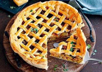 Разогреваем духовку до 220 °C. Слегка раскатываем оставшееся тесто в круг и выкладываем в круглую форму с высокими бортиками (тесто должно быть чуть выше бортиков). Распределяем начинку и обрезаем излишки теста, оставляя 1 см над начинкой. Смазываем свободные края слегка взбитым яйцом. Кладем на начинку решетку, защипываем край. Смазываем яйцом, стараясь, чтобы оно не стекало на срезы теста.