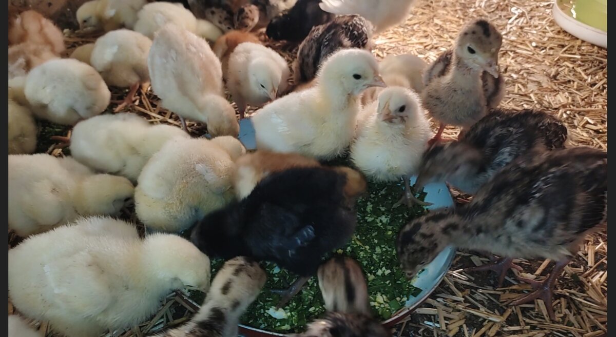 Как правило, покупая цыплят в инкубатории, вам сразу предложат приобрести аптечку для малышей, там будут антибиотики, витамины и множество пакетиков с чем только можно. Мы всегда выращиваем птицу без антибиотиков, используя зелень чеснока и лука. Это эффективный природный антисептик, обладает антипаразитным и глистогонным эффектом, к тому же это прекрасная профилактика авитаминоза. Перо лука и чеснока мелко нарезаем и добавляем к мешанкам. В первые дни делаем мешанку из измельчённого вареного яйца и зелени затем с недельного возраста добавляем отваренный картофель, если есть возможность творог, а к двум неделям вводим свежую, натертую морковь, тыкву и так далее. Так же, помимо мешанок всегда в кормушках присутствует стартовый корм. Рекомендуется давать зелень с пяти-суточного возраста, но мы понемногу даем уже со вторых суток. Так же хочется добавить то, что у нас дикий чеснок, его перо намного тоньше и нежнее чем у обычного чеснока. Поэтому, если есть возможность, можно его выращива