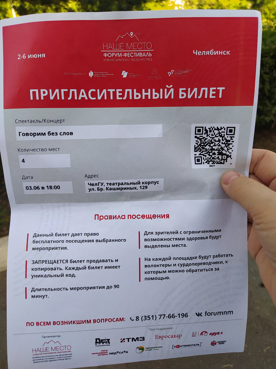 03 июня побывала на уникальном мероприятии на концерте "Говорим без слов" в рамках Форума-Фестиваля, который проходит в Челябинске со 2 по 6 июня. Добрый день, дорогие друзья! Меня пригласила на этот фестиваль моя давняя приятельница и я была четвертой в этом пригласительном билете. На улице, даже в тени 38 градусов, суббота, транспорта не дождаться, от дома до ЧелГУ добираться минут 40, я вышла за 2 часа до начала мероприятия. Мне на телефон пришло это приглашение, как знак того, что мы тебя ждём, поторопись. Наконец подошла маршрутка. Я чётко водителю-таджику сказала, чтобы он объявил остановку, где мне выходить. Он, болтая по телефону, пролетел эту остановку, забыв про меня. Но, я напомнила о себе, он резко остановился на светофоре и открыл дверь, я выскочила и побежала... Поздоровалась со всеми и бегом к агрегату, чтобы меня охладил. Настроение стало улучшаться))) До концерта познакомилась с выставкой художественных работ молодежи с инвалидностью "Это