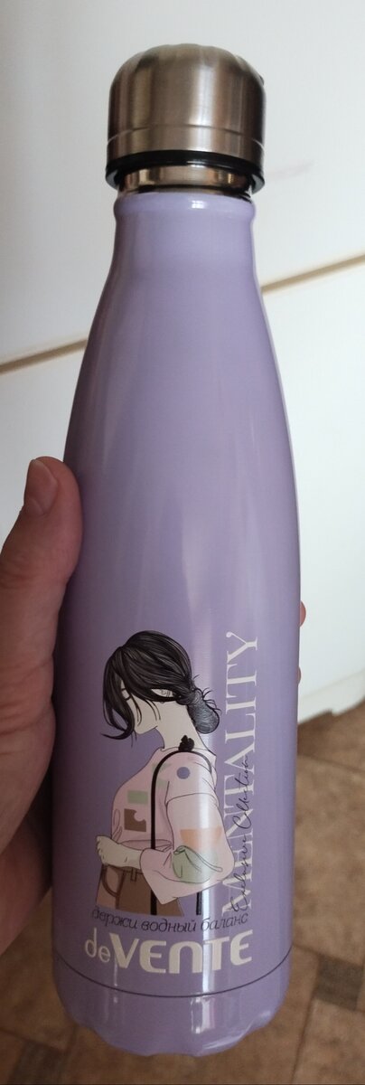 Увидела в магазине такую бутылку-термос. Цена 510 руб.. Чтобы с детьми летом идти гулять во двор, то лучше взять с собой и попить, и что-нибудь перекусить. И тут такая бутылка красивая продаётся. Расспросили продавца, она сказала, что они тут в магазине её испытывали. Прохладная вода держится около суток и не согревается. Горячая - поменьше. Но я думаю, для горячей лучше настоящий термос иметь, а не эту бутылку. Бутылка на 0,5 л воды или жидкости любой, сока... Она удобная в руке. Пробка герметичная. Написано, что нержавейка внутри. Попробуем. В сумочке она хорошо разместится. И на улице долго не согреется вода?! Кто-нибудь брал ли такую? Я беру именно для того, чтобы летом носить с собой прохладную воду. И если ехать на море, с собой будет всегда прохладная вода. Спасибо, что прочитали! Заходите ещё!