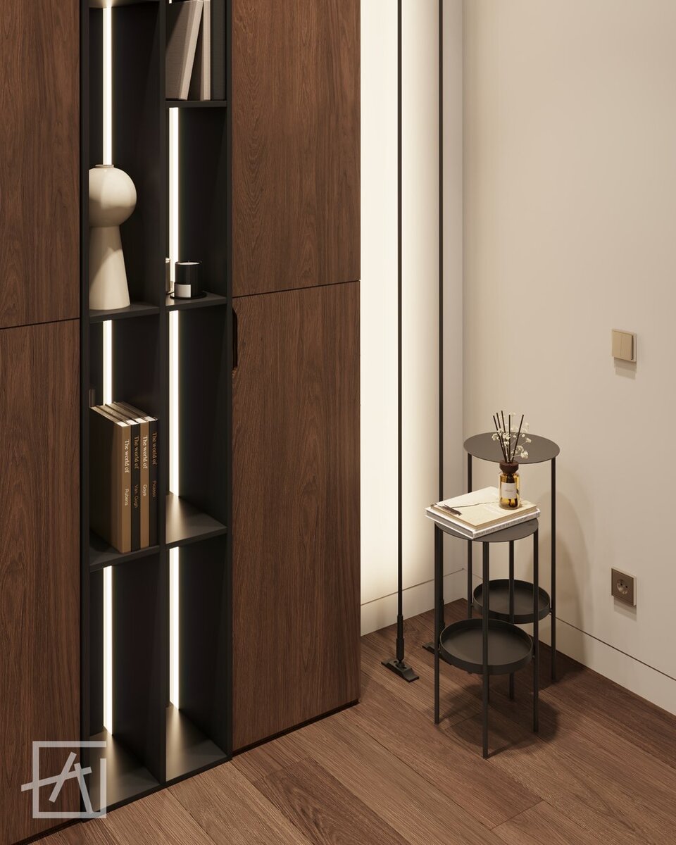 Холл всегда создает первое впечатление. Поэтому нам важно было отразить общую атмосферу «с порога» 😉 При входе в дом сразу открывается вид на шкаф с декором и подсветкой. Мы использовали светильники от Centersvet — они создают необычное впечатление и являются изюминкой этого интерьера. Для того, чтобы избавиться от визуального шума, мы использовали закрытые фасады шкафа для хранения коллекции книг. Открытые полки оставили для декора. Какое впечатление создает этот интерьер у вас? 👇🏻
