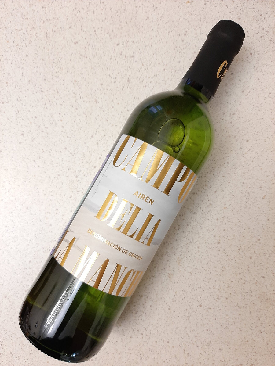 Некоторое время назад за какие-то смешные деньги (до 400 рублей) я приобрёл это вино. Ничего не зная про виноград айрен, я решил, что за такие деньги стоит попробовать. Тем более встречались на это вино и позитивные отзывы. Давайте сегодня его откроем. Пробуем Campo Delia La Mancha Airen,белое сухое. Бутылка Самая простая. Прозрачного стекла. Этикетка на любителя. Я не люблю такие, но, определенно, у нее есть плюс: такие этикетки способны остановить на себе взгляд. А так увеличенный золотой шрифт на белом фоне: скучно. Вино укупорено искусственной но миленькой пробкой крошечного размера Судя по контрэтикетке вино средней алкогольности, 11%. Про виноград айрен на одном из сайтов пишут следующее: "Айрен — испанский сорт белого винограда, из которого получаются легкие, свежие, ароматные вина сегмента масс-маркет. Хотя сорт не является широко известным, еще 10 лет назад по площадям виноградников он занимал третье место в мире после каберне совиньона и мерло. Сейчас айрен культивируют в осн