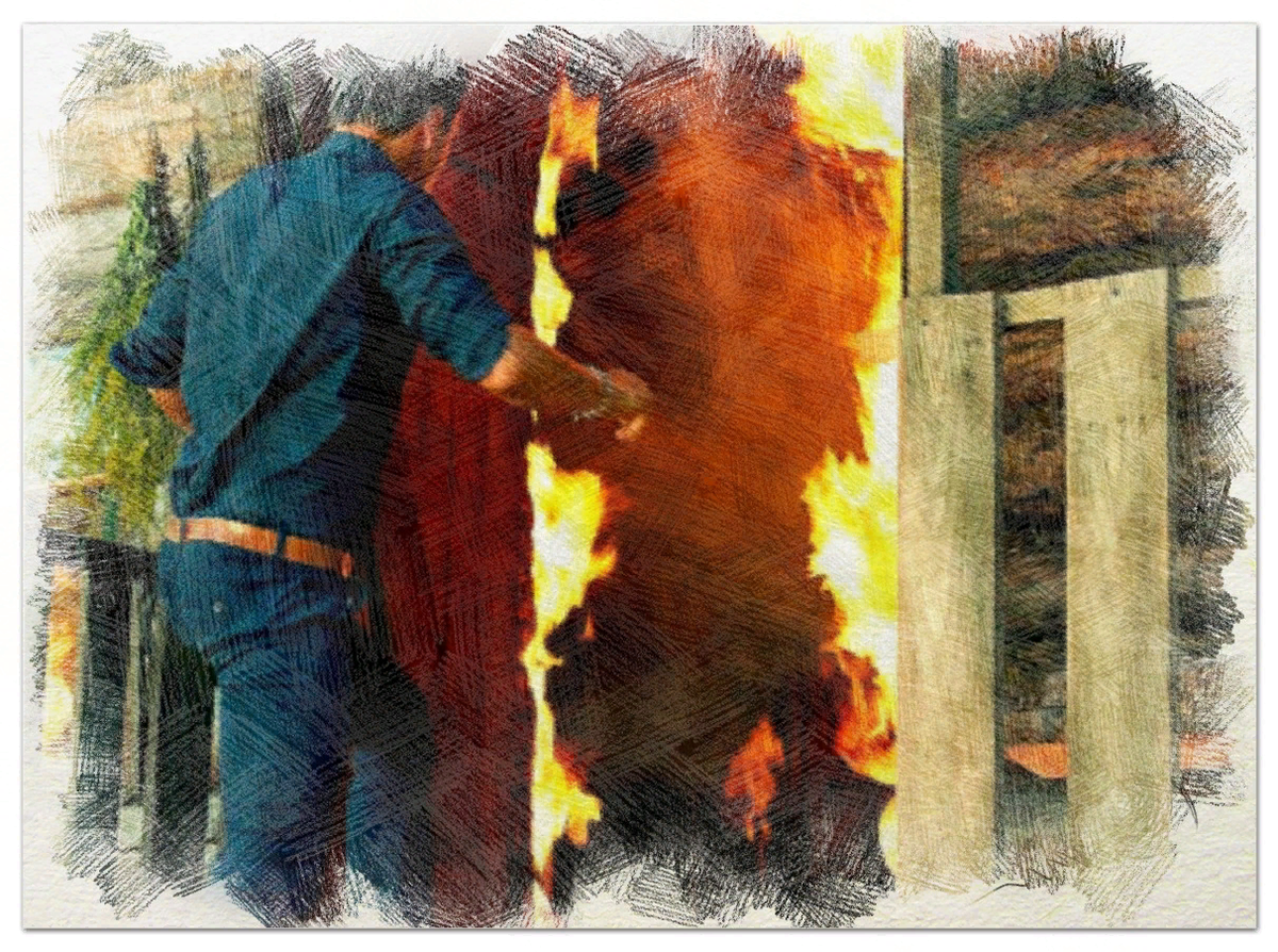 Краем глаза он видит женщину, которая обливает дом из канистры. После чего поджигает спичку и бросает на деревянную стену. Он уже проехал её, но в боковое зеркало заметил немыслимое. От увиденного, резко вдавил тормоз.
