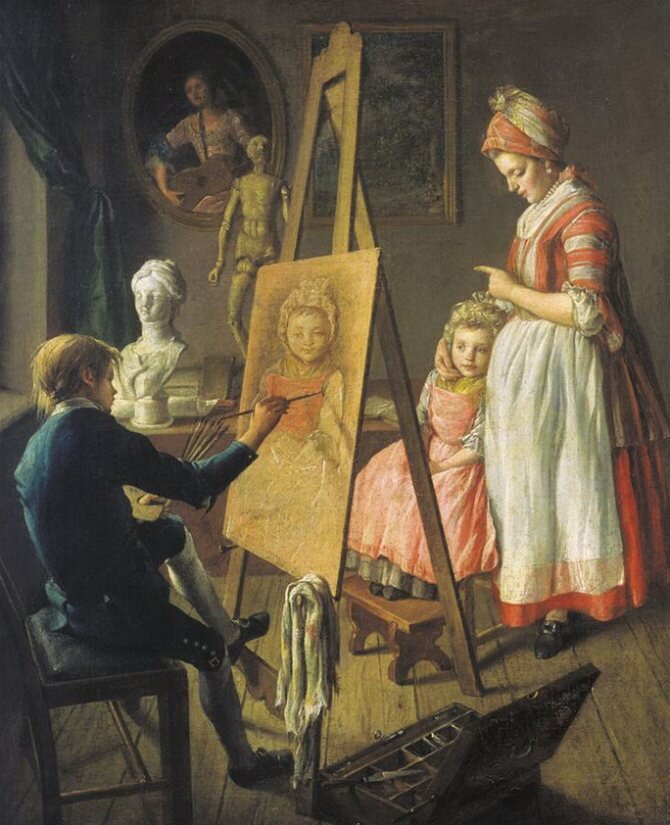 Расцвет жанровой живописи в России пришелся на вторую половину 19 века. Во многом ему способствовало творчество передвижников. Однако жанровые сценки в 18 веке все-таки встречались. Творчество передвижников было в том числе ответом на академический стиль, который затрагивал библейские и античные сюжеты, иногда исторические (но опять же преимущественно античные) и, разумеется, портреты (парсуны, как тогда говорили, от слова "персона"). Если говорить о том, когда в России появились картины с бытовыми сюжетами, то тут зависит от того, что брать за точку отсчета: работу российского живописца вообще, или работы созданную непосредственно в России. Если брать первое, то первой широко известной картиной стал "Юный живописец" Ивана Ивановича Фирсова. Ее же называют первой российской картиной в жанре рококо. Возможно, были и другие полотна, но упоминаний о них нет. Отец и дед автора были художниками, и И. И. Фирсов продолжил семейную династию. Родился живописец где-то на просторах Московской губ