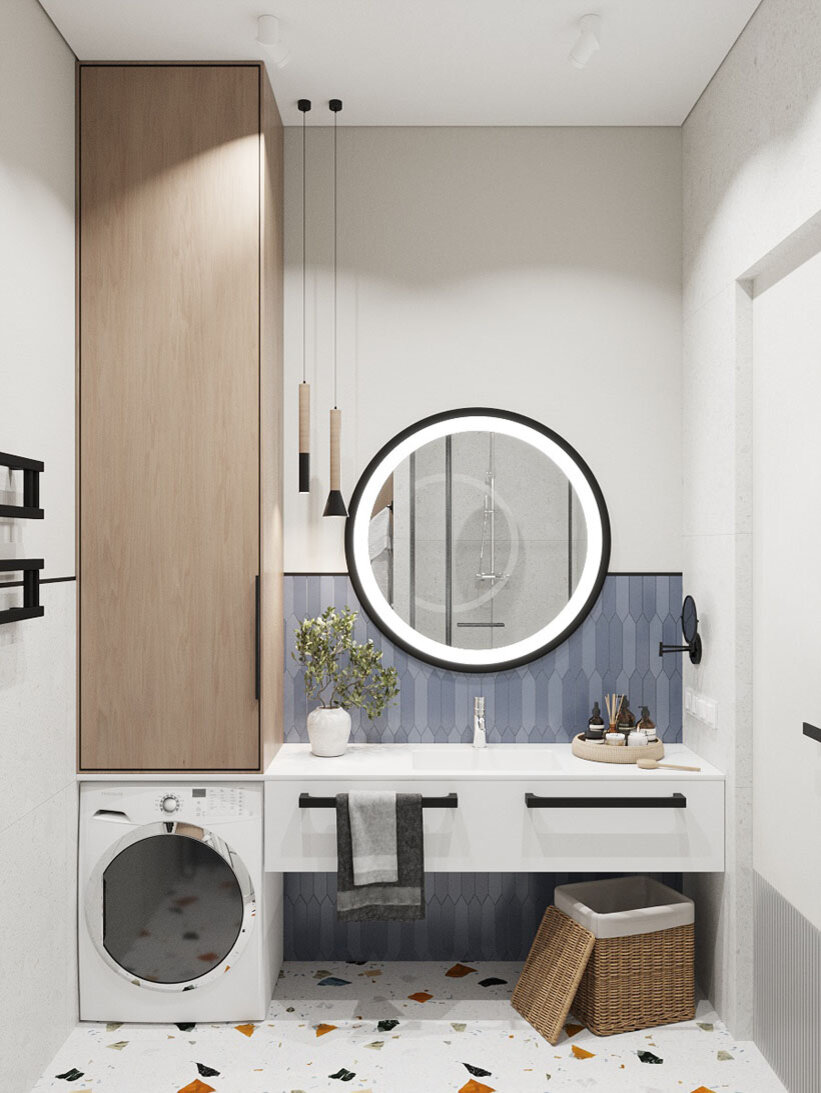 Дизайн-проект интерьера квартиры в современном стиле для энергичной и жизнерадостной девушки-студентки. Квартира в ЖК "NOW - Квартал на набережной", Москва. Санузел сохраняет основной белый цвет квартиры, но добавляются цветные акценты, небольшое помещение 5 м кв содержит акценты, за которые цепляется глаз и помогает ориентироваться в пространстве. Цветами и фактурами выделен пол в виде плитки, как разбросанная крупная галька в цветах дизайна интерьера, темная зона с укладкой плитки на фартуке раковины и стене инсталляции унитаза, дверцы шкафов под дерево. Видео: дизайн-проект интерьера этой квартиры В отделке стен и мокрой зоны душа использовался крупная плитка керамогранита под мелкую гальку. Фактурный матовый камень в светло-серой тональности. На фартуке в зоне раковины и блока стены инсталляции унитаза, в отделке использовалась стильная керамическая плитка кабанчик в укладке мозаикой. Акцентные черные линии в интерьере отмечают функциональные зоны: ручки дверей и шкафа, кайма на ст