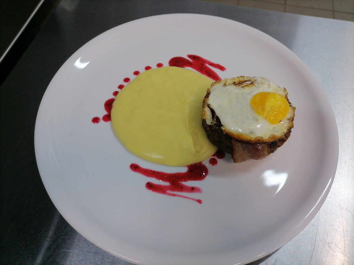 Ингредиенты: Говядина - 200 Шпик - 15 Бекон сырокопчёный - 20 Лук репчатый - 25 Перец -1 Соль - 3 Масло растительное - 50 Яйцо куринное - 1 шт. Технология приготовления. толщиной 2,0-2,5 см по 1 шт на порцию… до образования поджаристой корочки. готовности в жарочном шкафу при Т= 250-280 C (5-7 мин). При подаче на бифштекс положить яичницу-глазунью из одного яйца. Наш бифштекс с яйцом готов. Приятного аппетита.