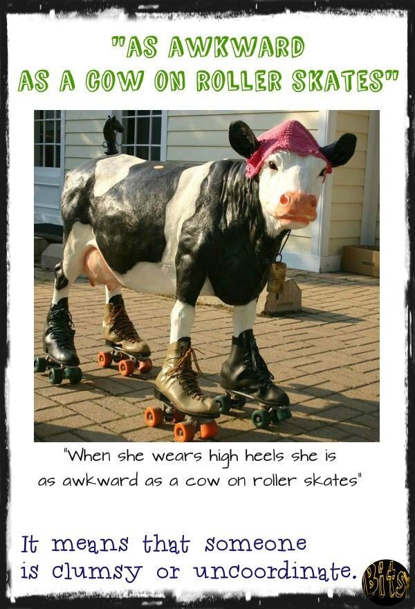 Hi, guys 👋 Сегодня мы с вами выучим ещё одну очень интересную идиому! Как вы думаете как сказать, что вам очень неудобно/ очень неловко? В русском языке есть такая фраза "как корова на льду⛸️", в английском же будет почти также, только как "🐄 на роликовых коньках " 🔸️as awkward as a cow on roller skates Пример использования: Jane isn't a much of a dancer, and she was as awkward as a cow on roller skates when Jim invited her. (Джейн не очень хороший танцор, она была неуклюжа, как корова на роликах, когда Джим пригласил ее). ТГ канал с полезностями: