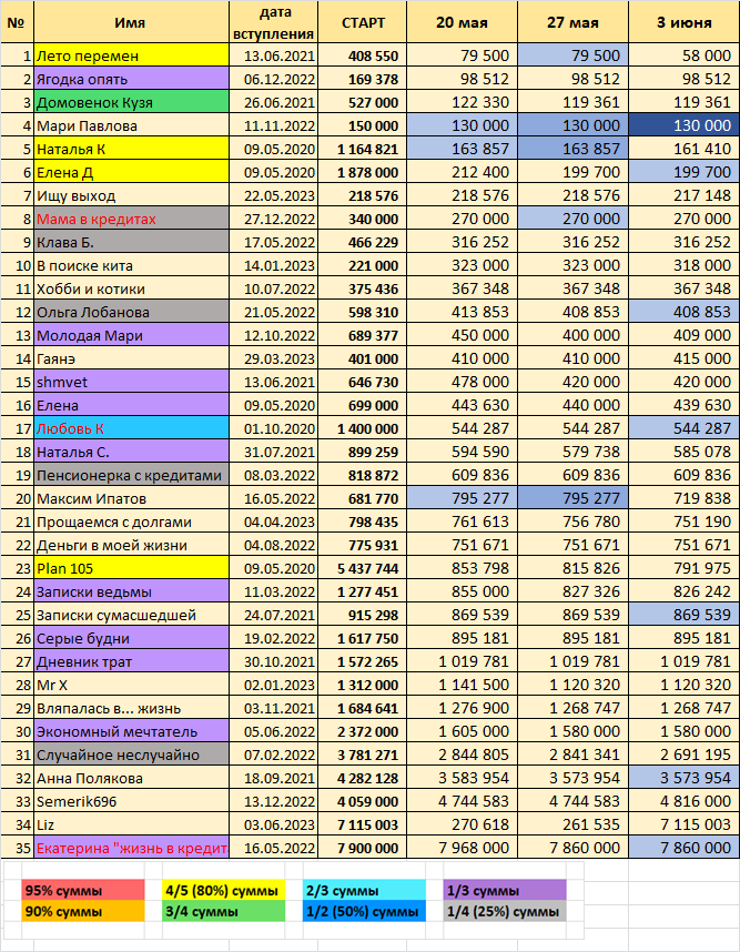 Всем доброго времени суток))) Шучу-шучу, здравствуйте! Сегодня много новостей, много призёров, так что садитесь поудобнее, начинаем! Вначале небольшое объявление. Участница Liz заново вступает в марафон, с новой суммой и с новой даты. Хотя она уже почти год с нами (с 20 июня 2022) и снизила долг где-то вполовину, но теперь поменялись исходные данные: имеется ипотека, увеличившая сумму обязательств в 27(!!!) раз. Решено, что лучше начать заново, потому что это надолго. Сегодня все большие молодцы, но давайте же посмотрим, кто у нас попадает в лидеры этой недели: Случайное не случайно погасила 150146 и заняла первое место! С большим отрывом второе место занимает Максим Ипатов с результатом 75439р. А замыкает тройку лидеров Plan 105 - минус 23851р. Поздравляем! А вот как выглядит погашение за неделю в процентах от суммы: Случайное не случайно, занимающая первое место по сумме погашения, в процентах оказывается лишь на третьем месте! Она погасила 5,28% от долга. На втором - Максим Ипатов,